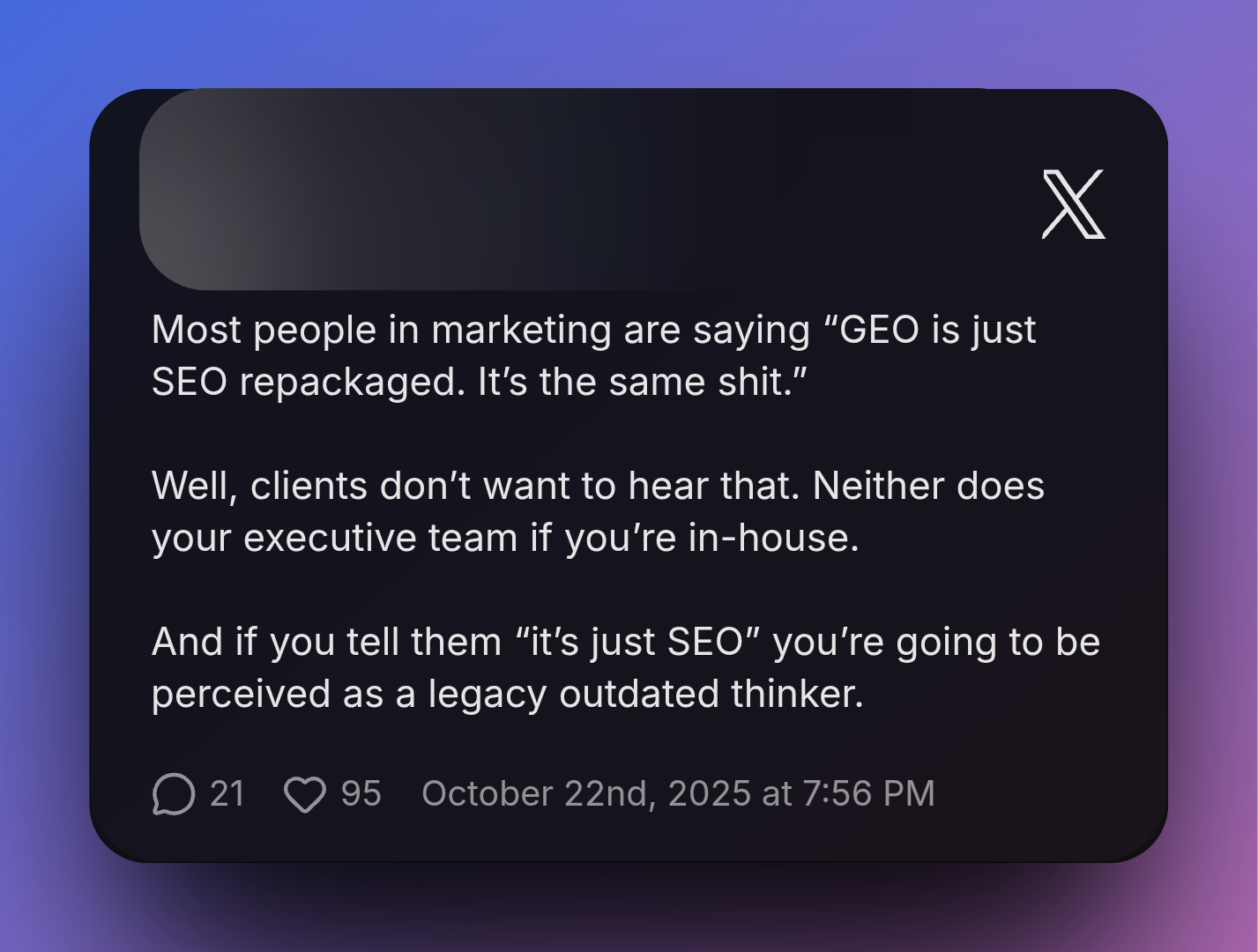 Az X-en egy széles körben megosztott bejegyzés megragadja a mentalitást – és a viselkedésre hivatkozom, nem a személyre, mert ez a pozíció jelenleg mindenhol megtalálható az iparágban. Az érv: az ügyfelek nem akarnak hallani arról, hogy a GEO „csak a SEO újracsomagolása”. Ahogy a vezetői csapata sem. Mondja el nekik, hogy „ez csak SEO”, és Önt „hagyományos, elavult gondolkodóként fogják fel”. Még az is lehet, hogy „egy GEO ügynökség helyettesíti”. A konklúzió: „akár tetszik, akár nem… az Ön érdeke, hogy felszálljon az AI vonatra.”