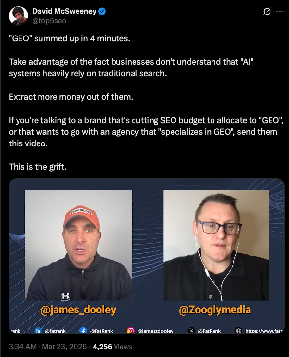 David McSweeney már azelőtt foglalkozik SEO-val, hogy a GEO startupok néhány alapítója nem végzett. Éveket töltött azzal, hogy ugyanazt a taktikát írja le, amelyet most a GEO címke alatt csomagolnak át (tartalom frissesség, digitális PR, közösségi részvétel, linképítés), és ezt bizonyítja a megjelenési dátumok is. Összefoglalója a GEO prezentációjáról: használja ki azt a tényt, hogy a vállalkozások nem értik az AI-rendszereket, a hagyományos keresésre támaszkodnak, és több pénzt vonjanak ki belőlük.