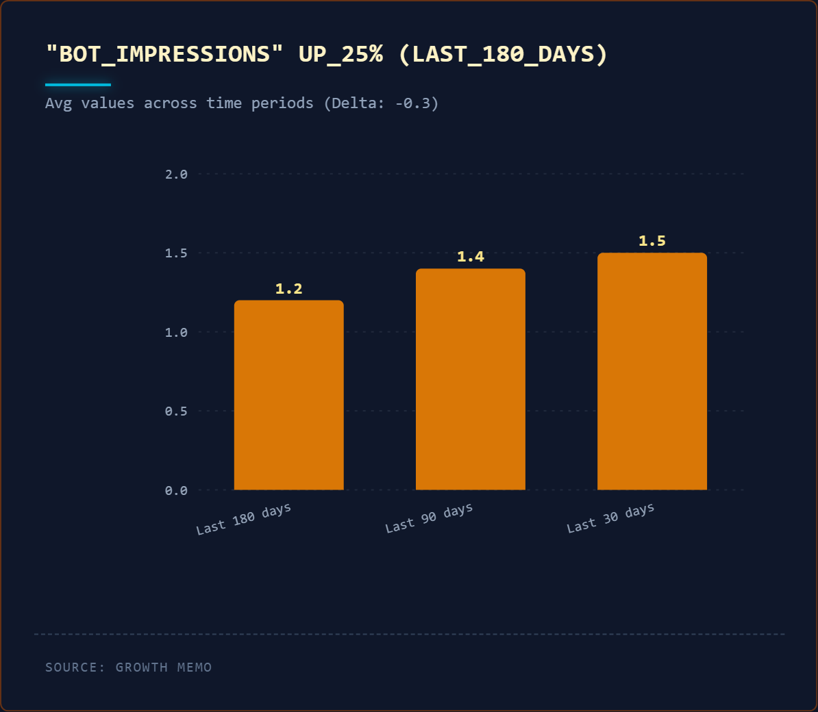 - Kifejezetten a SaaS esetében 1-3%-os alapértékre számítson a botmegjelenítések tekintetében. A kiterjedt dokumentációt, műszaki útmutatókat vagy automatizált keresőoptimalizálási oldalakat tartalmazó webhelyek trendje magasabb (4-6%).