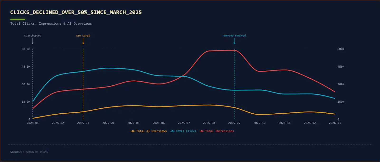 - Kövesse nyomon, hogy mikor csökkent a kattintások száma a Google AIO bevezetési idővonalához képest (2025. márciusi csúcs). A rossz tartalomminőség fokozatos hanyatlást mutat; Az AIO hatás éles és lekérdezésspecifikus.