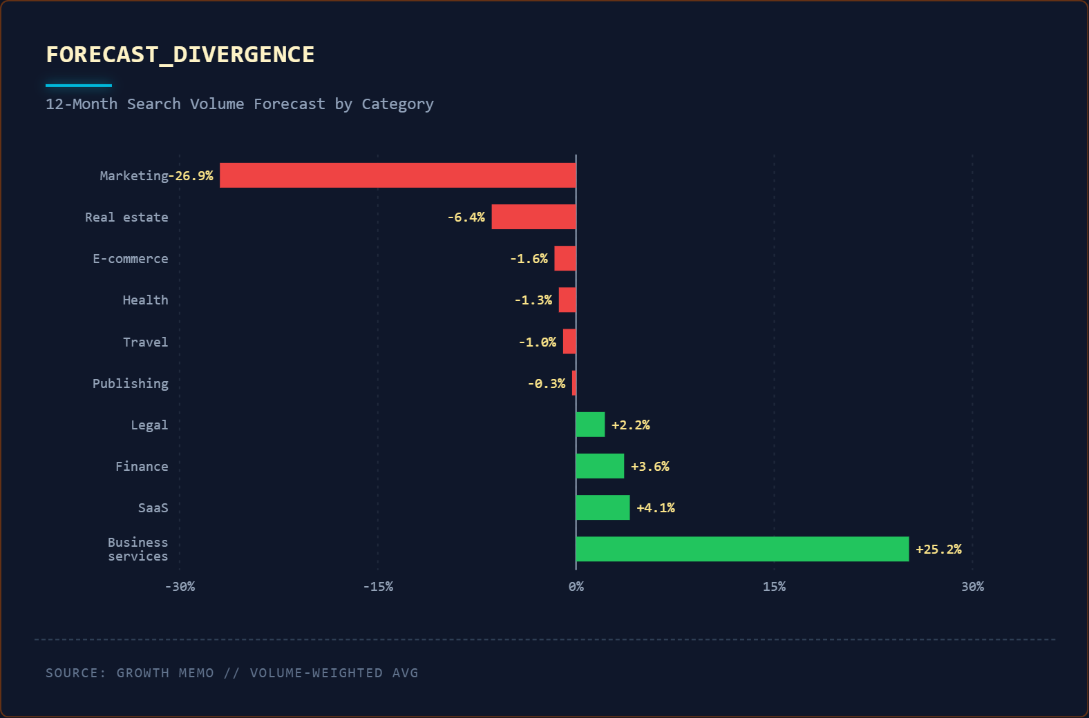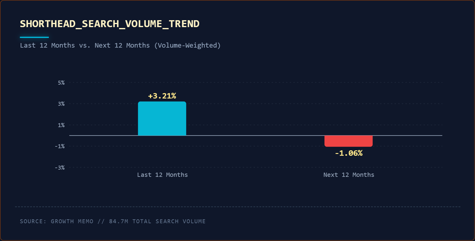 Körülbelül 10 000 rövid fejű kulcsszó elemzése azt mutatja, hogy a kollektív keresési mennyiség csak 1,2%-kal nőtt az elmúlt 12 hónapban, és az előrejelzések szerint a következő 12 hónapban 0,74%-kal fog csökkenni.