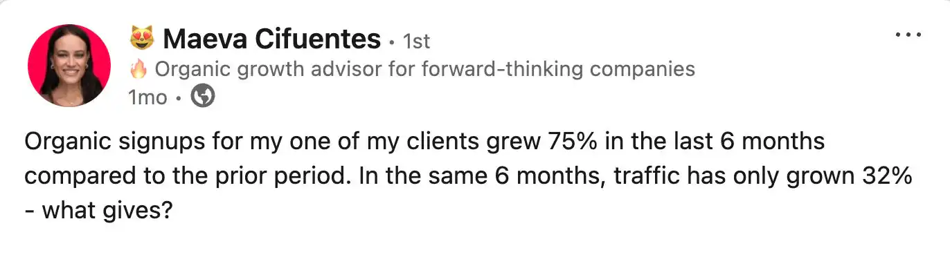 Decemberben Maeva Cifuentes 32%-os forgalomnövekedésről számolt be egyik ügyfelénél, míg a feliratkozások száma 75%-kal nőtt ugyanebben a hat hónapos időszakban. Hozzászólása Gaetano DiNardi egyik válasza volt, aki nem talált összefüggést a forgalom és a csővezeték között több B2B SaaS-cégnél, akiknek tanácsot ad. A Maeva ügyféladatai azt mutatják, hogy a csővezeték 2,3-szor gyorsabban nőhet, mint a forgalom. Gaetano adatai azt mutatják, hogy növelheti a csővezetéket, miközben a forgalom változatlan marad, vagy akár csökken is.
