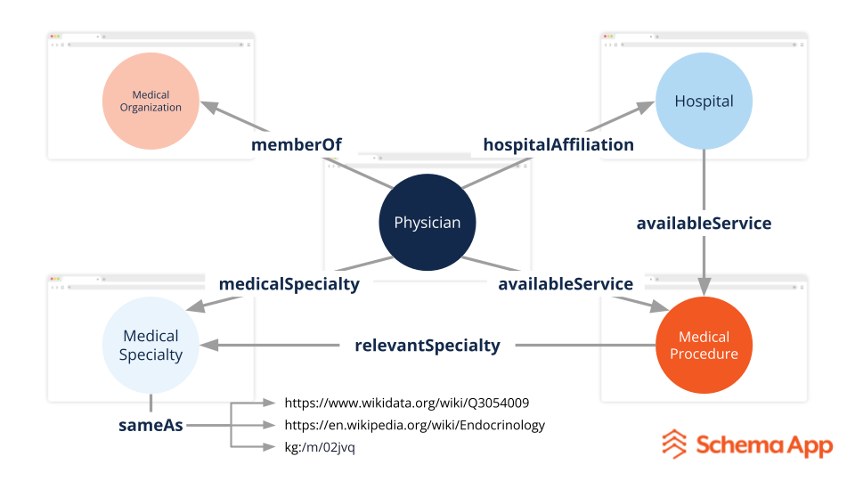 Képzeljünk el például egy oldalt egy orvosról. A sémajelölés az orvost írja le. Robusztus, szemantikus A markup a Wikidatához és a Google tudásgráfjához is kapcsolódna, hogy meghatározza szakterületüket, miközben összekapcsolja az általuk nyújtott kórházakat és egészségügyi szolgáltatásokat.