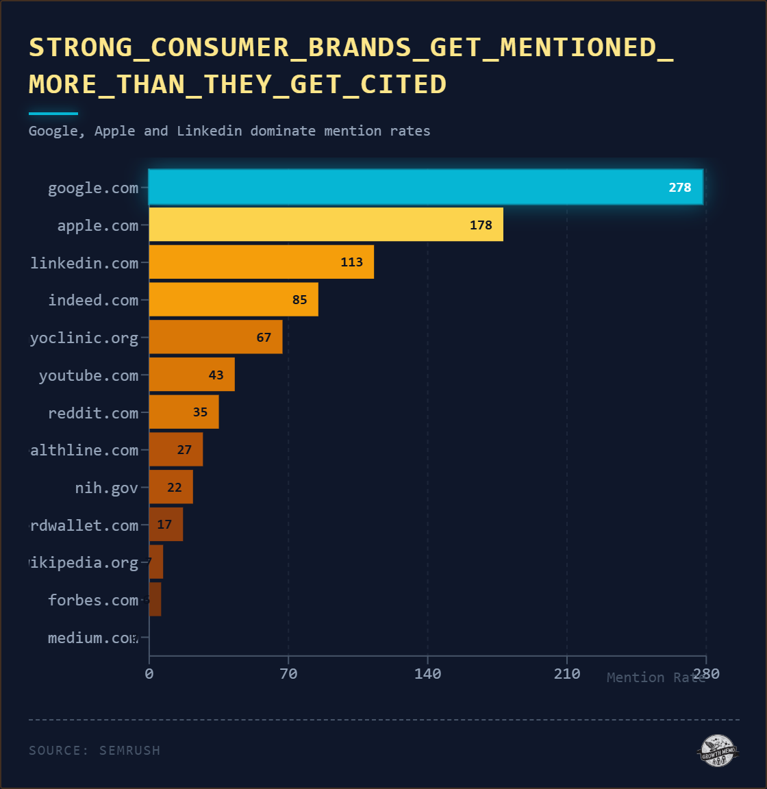 A domainek 74,9%-át idézték, és 38,3%-át említették. Az idézetek 61,7%-a szellemhivatkozás: a domain forráshivatkozást kap, de nulla névfelismerést a válaszszövegben.