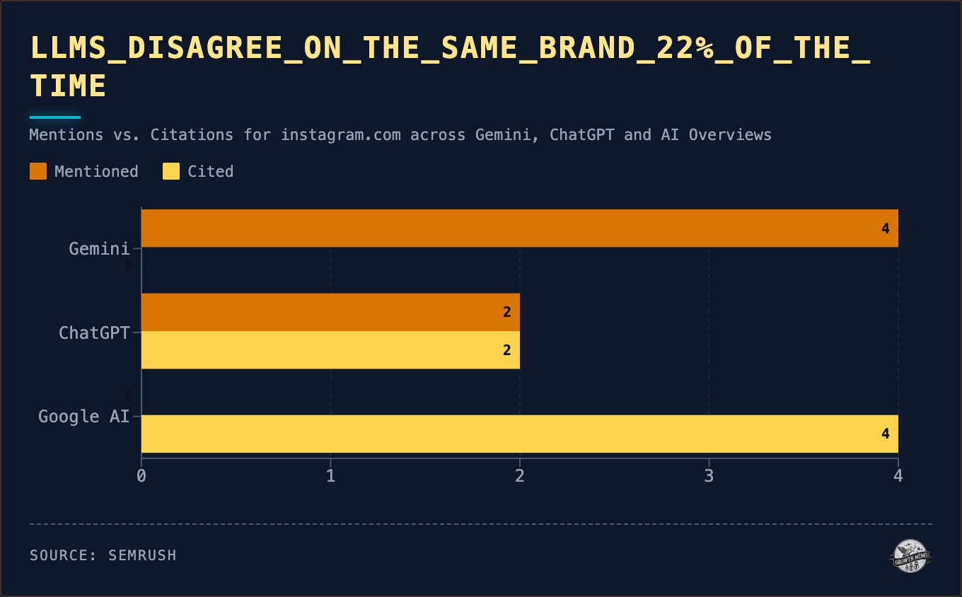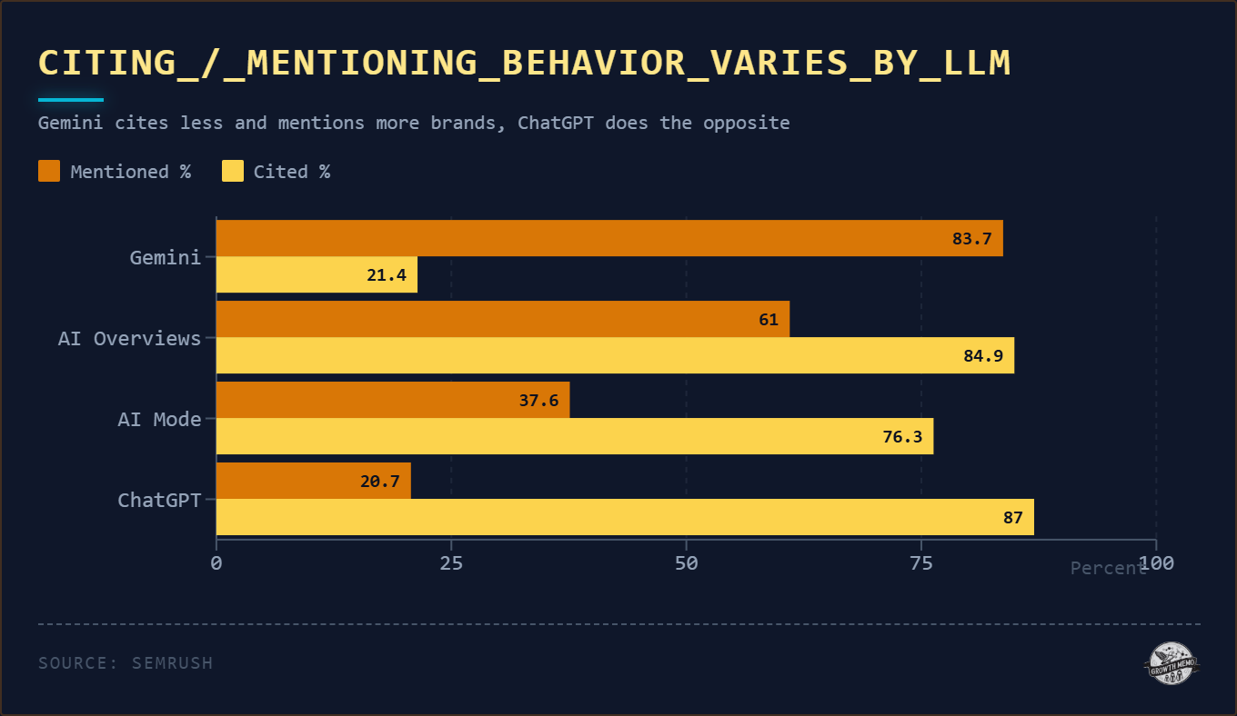 A márkák esetében ez azt jelenti, hogy a Gemini láthatósága és a ChatGPT láthatósága nem ugyanaz. (Ez az adathalmaz egyértelmű bizonyítékot mutatott arra, hogy nem sok átfedés volt a ChatGPT idézetekkel/megemlítésekkel és a Gemini idézetekkel/megemlítésekkel ugyanazon felszólítások esetében.) Az egyikre való optimalizálás nem segít a másikon. Nincs egyetlen „AI láthatósági mérőszám”. Legalább 4 különböző viselkedési rendszer fut párhuzamosan.