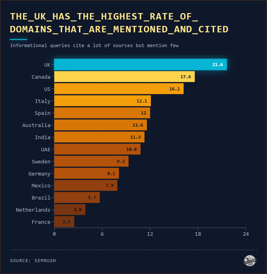 Ez az elemzés 3981 domainre támaszkodik 115 promptból, 14 országból és négy mesterséges intelligencia keresőmotorból (ChatGPT, Google AI Overviews, Gemini, AI Mode), a Semrush AI Toolkit adatainak felhasználásával. Minden megjelenést „idézett” (forráshivatkozás jelen van) és/vagy „megemlített” (a márkanév a válaszszövegben) címkével látnak el. A két állam közötti szakadék a szellemidézés problémája.
