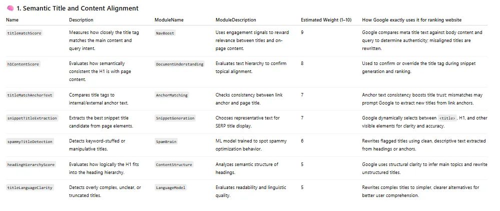 A titleMatchAnchorText biztosítja, hogy címcímkéinket és fejléceinket összehasonlítsák a belső és külső horgonyokkal, és az oldal hierarchiájához (a headingHierarchyScore).