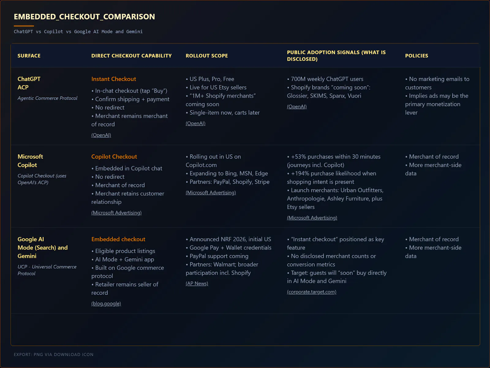 - A Microsoft Copilot az ACP-t használja, és a Copilot Checkout szolgáltatást kínálja PayPal, Shopify és Stripe szolgáltatással.