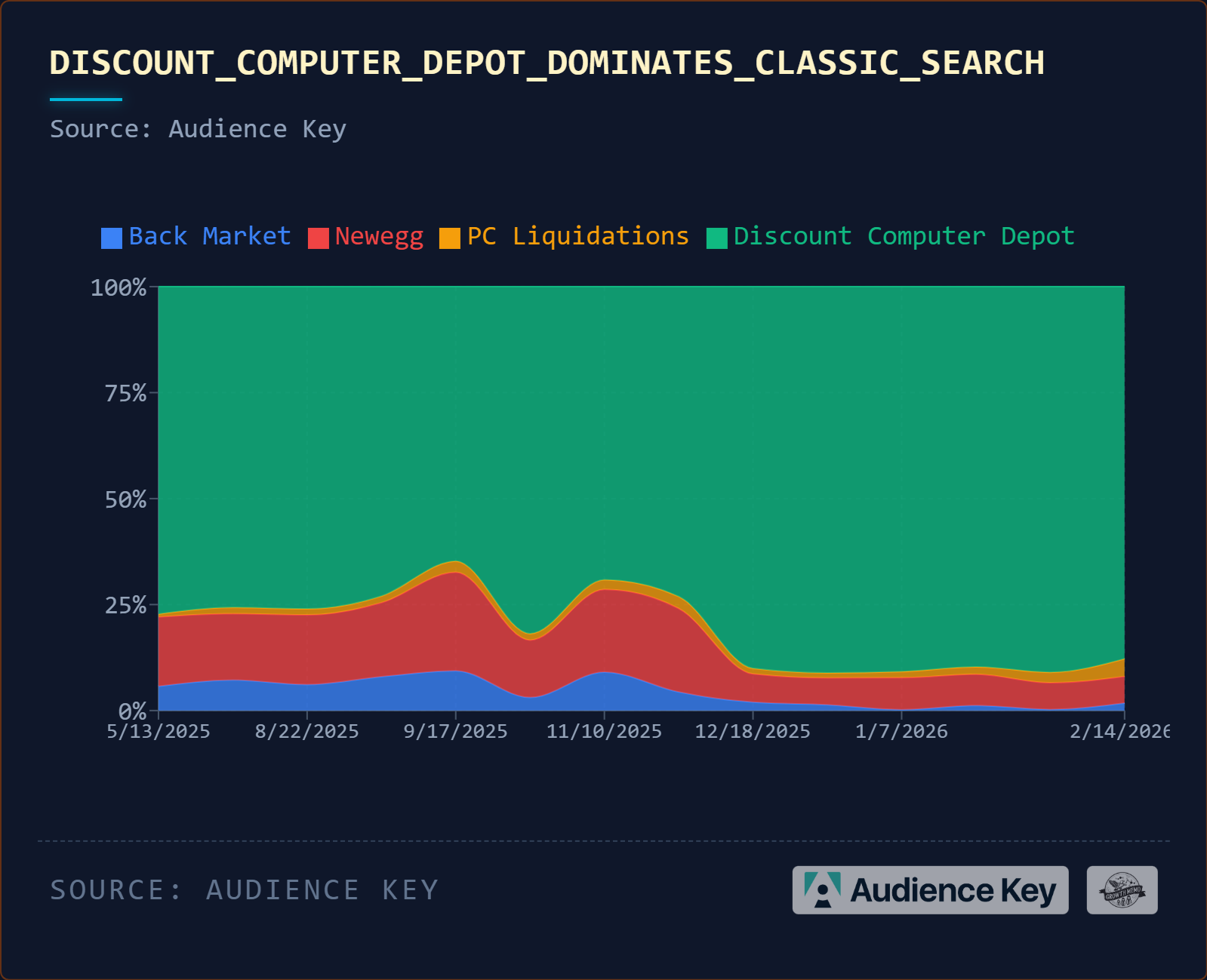 A Discount Computer Depot a hagyományos SEO erőmű. 2026 elején több mint 87%-os (4,6 m/5,2 m) standard organikus rangsort értek el az első 3 helyen.