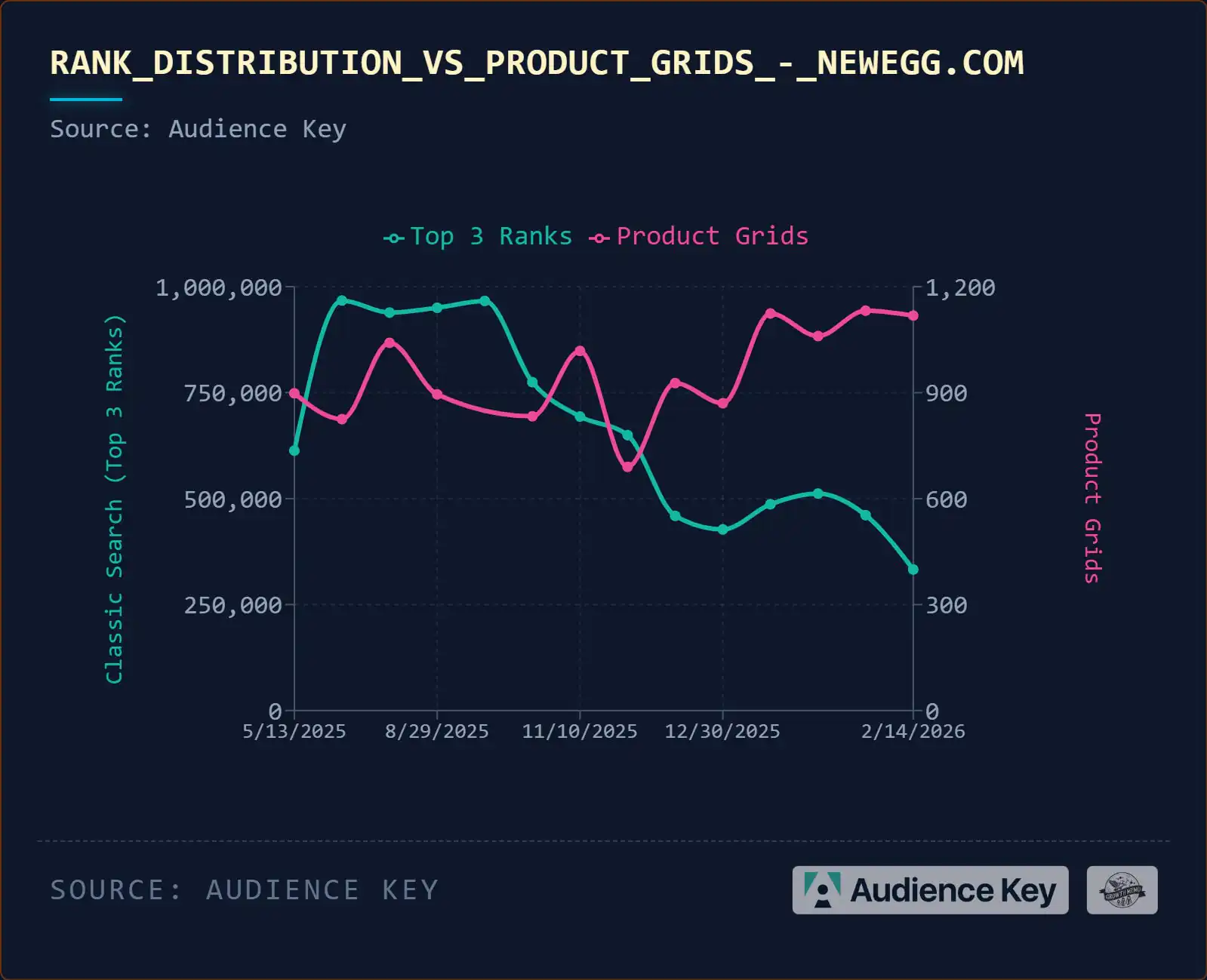 Más szereplők, például a Newegg, hasonló trendeket látnak, mint a Back Market: a klasszikus organikus rangsorok csökkennek, miközben a termékrács-elhelyezések nőnek.