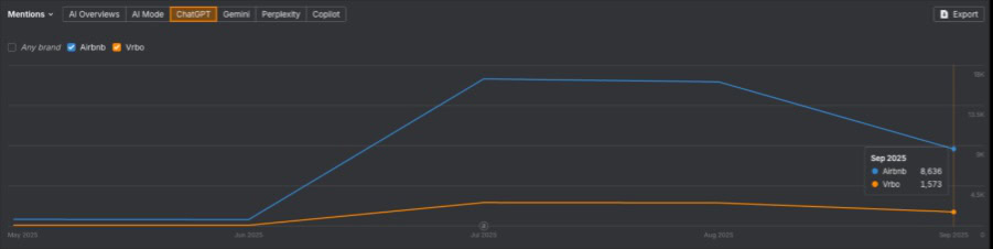 De ha megnézzük a becsült ChatGPT említéseket (2025. szeptember), az Airbnb-nek ~8636, míg a Vrbo-nak csak ~1573-a van. Ez az arány ~11:2.
