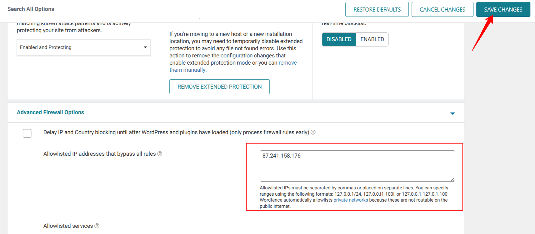 Például a WordPressben használhatja a Wordfence ingyenes beépülő modulját, hogy engedélyezőlistára helyezze a legitim IP-címeket a hivatalos listákról (mint fent), és blokkoló egyéni szabályokat adhat hozzá az alábbiak szerint:
